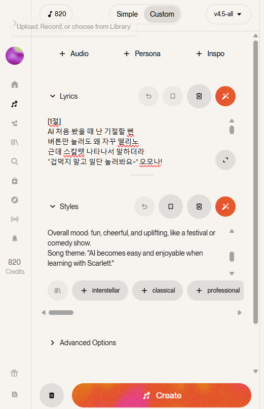 4. 방금 만든 가사를 Suno에 그대로 넣기
