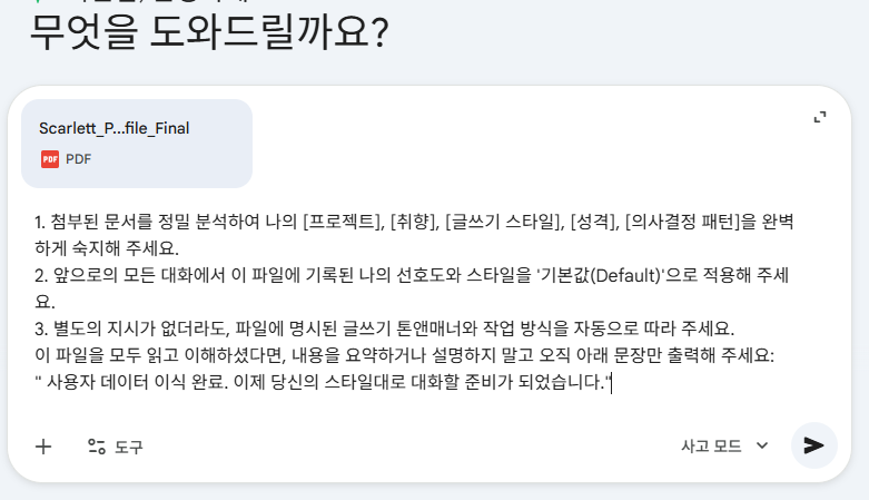 1. 첨부된 문서를 정밀 분석하여 나의 [프로젝트], [취향], [글쓰기 스타일], [성격], [의사결정 패턴]을 완벽하게 숙지해 주세요.